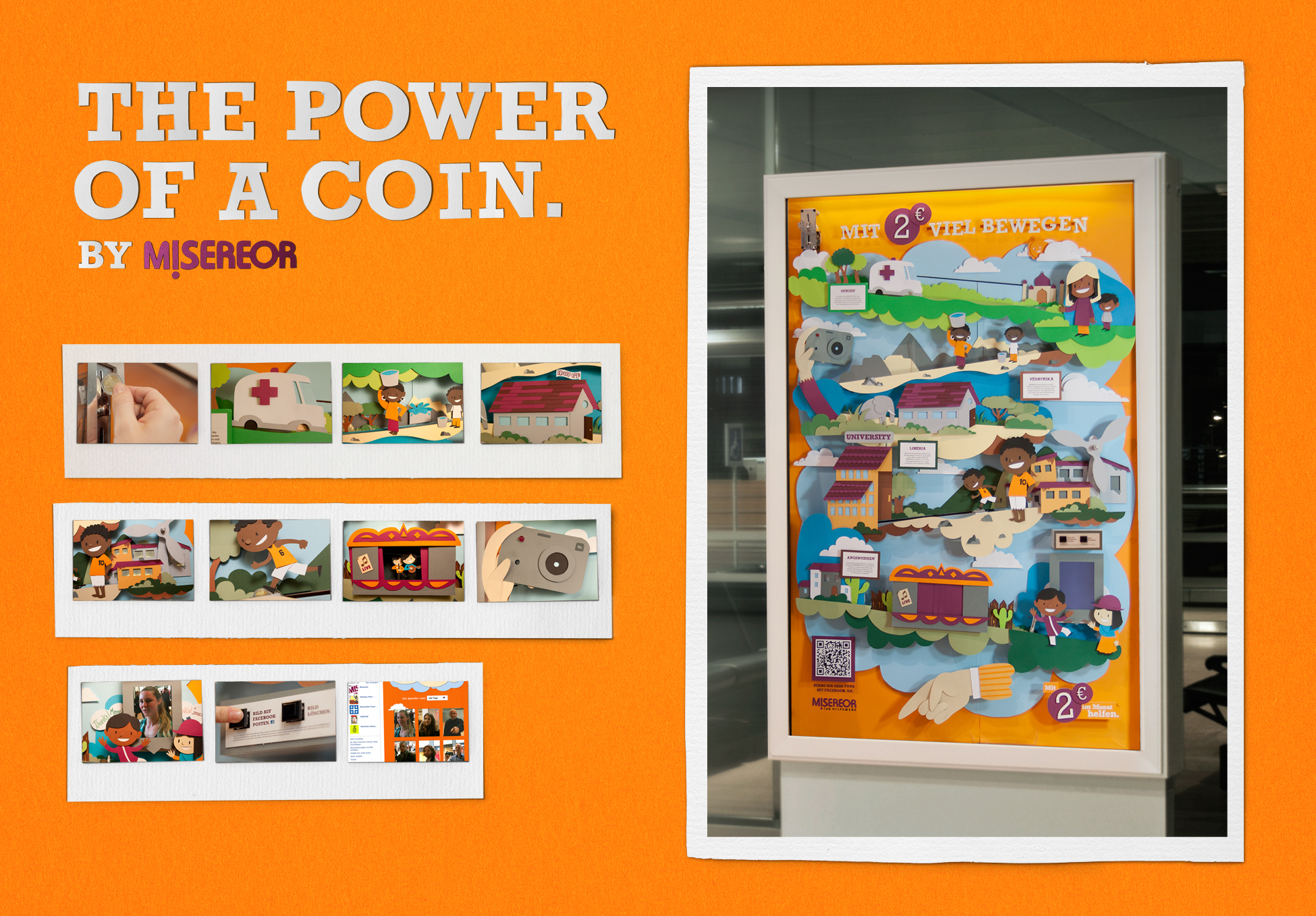 MISEREOR is one of the most active children’s charities in Europe, collecting donations year after year to support its international projects. But there could never be enough. If only everyone knew that even a small contribution can make a big difference – starting with just 2 €! The objective was to communicate this message to a wide audience over the long term. “The Power Of A Coin” – a billboard that has been redesigned to be an interactive donation box. When 2 € are donated directly on the billboard, the various MISEREOR aid projects visually come to life. A built-in camera takes a photo of the donor, which he can post on Facebook.